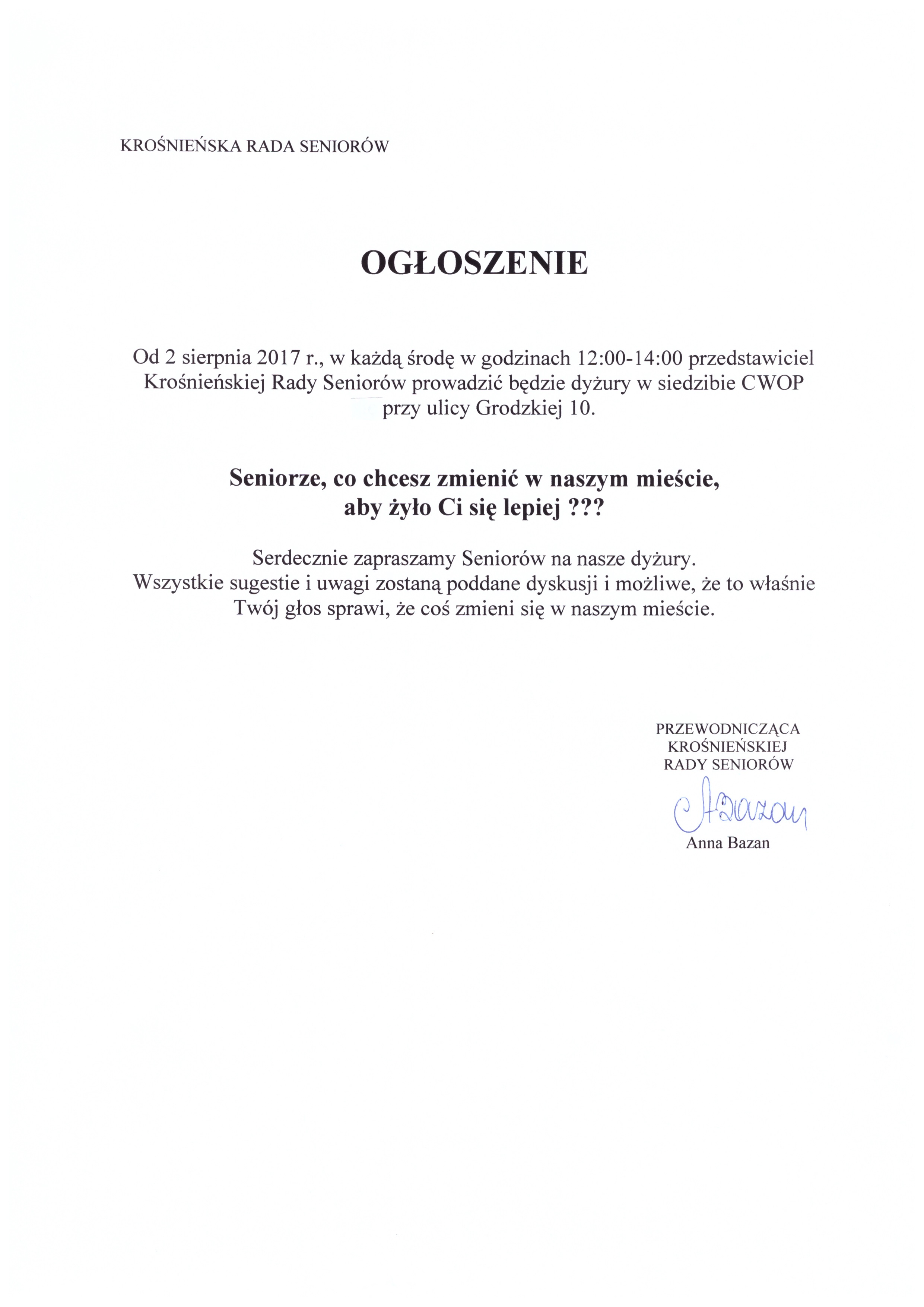 Krośnieńska Rada Seniorów podczas dyżurów, będzie miała możliwość wysłuchania opinii osób starszych oraz zdiagnozowanie ich potrzeb. Spotkanie z przedstawicielami Rady, będzie także doskonałą okazją do zainicjowania zadań aktywizujących krośnieńskich seniorów.