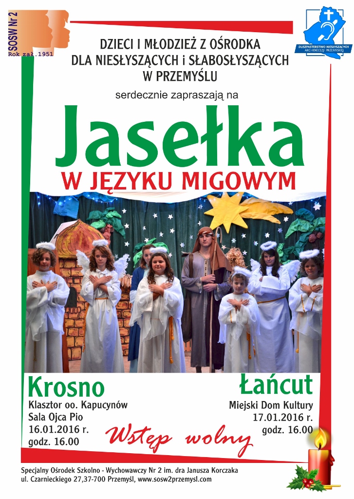 Dzieci i młodzież z Ośrodka dla Niesłyszących i Słabosłyszących w Przemyślu zapraszają serdecznie na Jasełka w języku migowym. Spektakl w najbliższą sobotę j. 16 stycznia o godz. 16.00 w Sali Ojca Pio przy Klasztorze oo. Kapucynów w Krośnie.