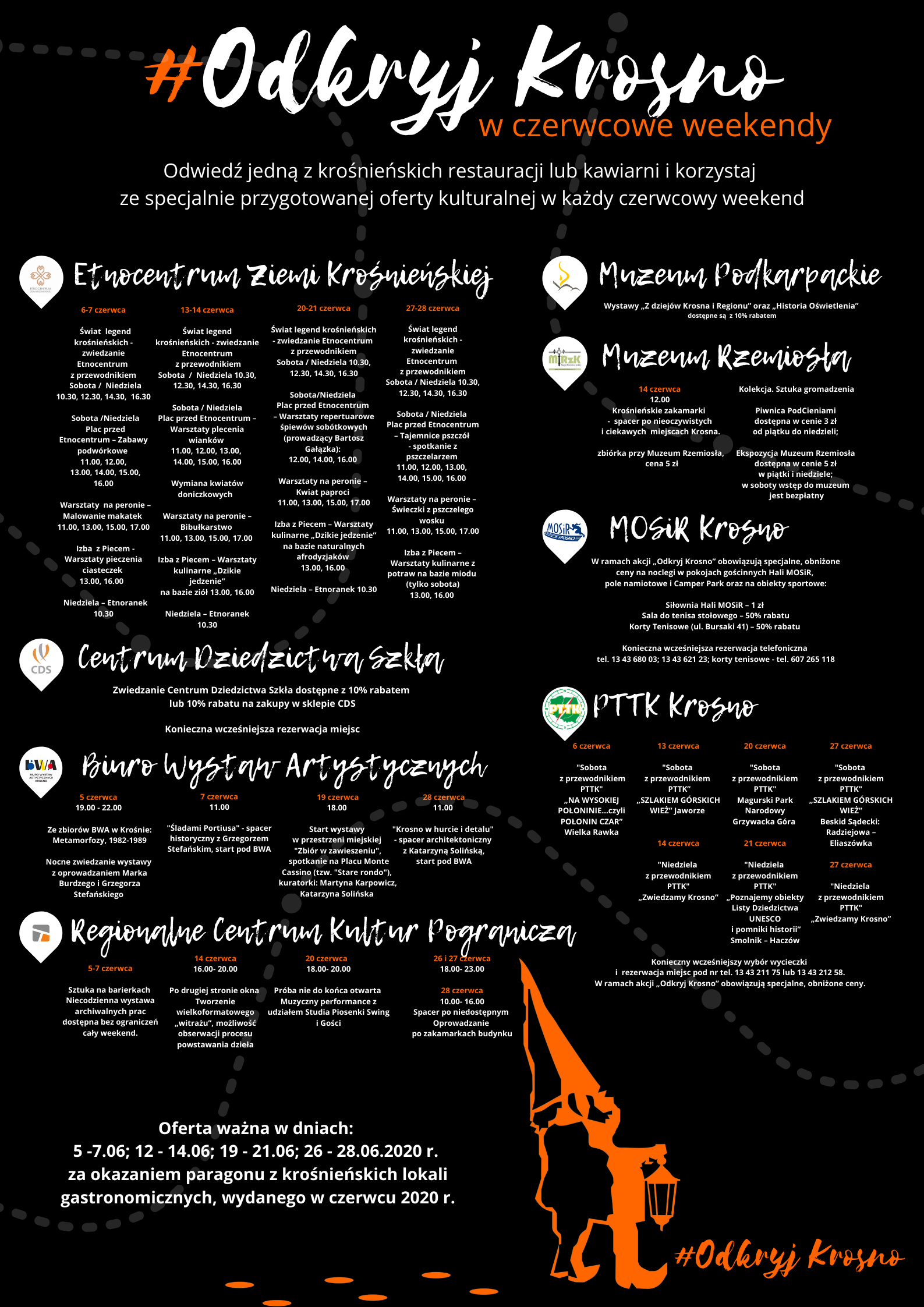 Szczegółowy program dostępny jest na plakatach oraz tutaj. Oferta ważna jest w dniach 5-7.06; 12-14.06; 19-21.06; 26-28.06 2020 za okazaniem paragonu na kwotę min. 10 zł, wydanego w czerwcu 2020 r. przez krośnieńskie lokale gastronomiczne. Regulamin kampanii promocyjnej #OdkryjKrosno dostępny jest tutaj.