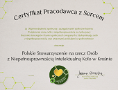 12.11.2020Działania PSONI Koło w Krośnie w zakresie aktywizacji zawodowej osób z niepełnosprawnością intelektualną zostały docenione i wyróżnione Certyfikatem Pracodawca z sercem. -