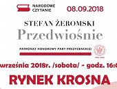 04.09.2018Już w najbliższą sobotę 8 września br. o godz. 16.00 na krośnieńskim rynku, w ramach ogólnopolskiej akcji "Narodowe Czytanie", czytamy "Przedwiośnie" Stefana Żeromskiego /fragmenty, zgodnie z oryginałem powieści/. Każdy będzie mógł otrzymać także pamiątkową pieczęć przesłaną przez Kancelarię Prezydenta. Serdecznie ZAPRASZAMY! -