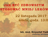 15.11.2017W środę 22 listopada 2017 r. o godzinie 13:00 w Centrum Wspierania Organizacji Pozarządowych w Krośnie przy ul. Grodzkiej 10, odbędzie się prelekcja pt. „Jak być zdrowszym i stosować mniej leków?”, którą wygłosi lek. med. Krzysztof Tlałka – geriatra, internista, Ordynator Oddziału Medycyny Paliatywnej w Szpitalu Specjalistycznym w Brzozowie. -