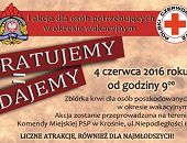 24.05.2016Klub Honorowych Dawców Krwi Polskiego Czerwonego Krzyża przy Komendzie Miejskiej Państwowej Straży Pożarnej w Krośnie w sobotę 4 czerwca 2016 roku (sobota) od godz. 9.00 organizuje zbiórkę krwi dla poszkodowanych w wypadkach w okresie wakacyjnym. Akcja ta zostanie przeprowadzona na terenie tut. komendy przy ul. Niepodległości 6, (plac wewnętrzny). -