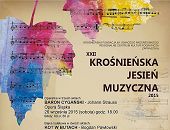 07.09.2015Po raz XXII Regionalne Centrum Kultur Pogranicza w Krośnie zaprasza wszystkich miłośników dobrej muzyki na Krośnieńską Jesień Muzyczną. W programie m.in. Baron Cygański Johanna Straussa, koncert „Moc przeznaczenia” Młodzieżowej Orkiestry Symfonicznej, czy koncert - Jan Sebastian Bach i jego epoka w wykonaniu Krzysztofa Jakowicza (skrzypce) i Marka Stefańskiego (organy), a dla dzieci Kot w butach w wykonaniu artystów Opery Śląskiej. Zapraszamy do kasy RCKP, ul. Kolejowa 1. -