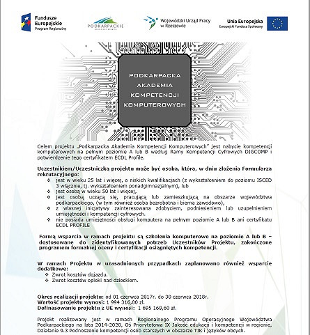 Projekt „Podkarpacka Akademia Kompetencji Komputerowych” realizowany jest przez Podkarpacką Akademię Przedsiębiorczości Katarzyna Podraza, w ramach Regionalnego Programu Operacyjnego Województwa Podkarpackiego na lata 2014-2020. Projekt współfinansowany przez Unię Europejską z Europejskiego Funduszu Społecznego.