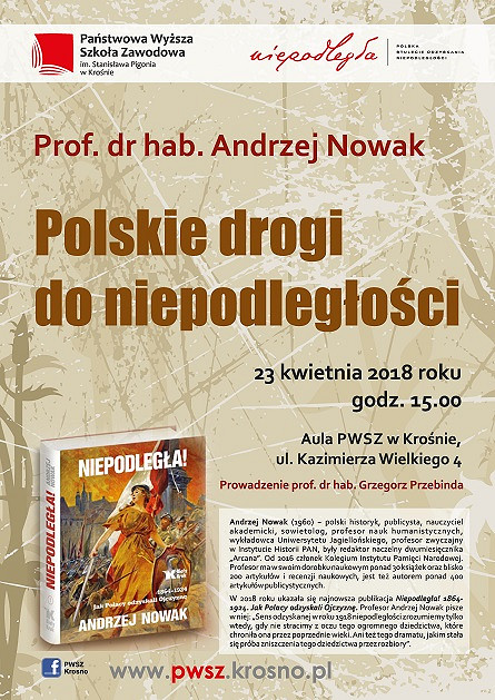 Rektor Państwowej Wyższej Szkoły Zawodowej im. S. Pigonia w Krośnie serdecznie zaprasza na wykład prof. dr hab. Andrzeja Nowaka "Polskie drogi do niepodległości" w ramach obchodów 100-lecia odzyskania niepodległości.
