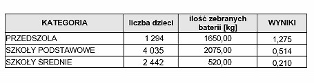 W XV edycji konkursu łącznie zebrano 4 245 kg zużytych baterii. Nagrody przyznano najlepszym w 3 kategoriach wiekowych w zależności od rodzaju placówki oświatowej tj. kategoria: przedszkola, szkoły podstawowe, szkoły średnie.
