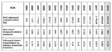 Wraz z końcem roku szkolnego 2018/2019 zakończył się konkurs zbiórki zużytych baterii. To już 15 lat dzieci i młodzież z krośnieńskich przedszkoli, szkół podstawowych i średnich zbierają zużyte baterie. W pierwszej edycji konkursu w 2004 roku, zebrano 878 kg. W tym roku dzieci i młodzież zebrali ponad 4 tony. Jak widać świadomość ekologiczna młodych Krośnian oraz ich najbliższych rośnie.