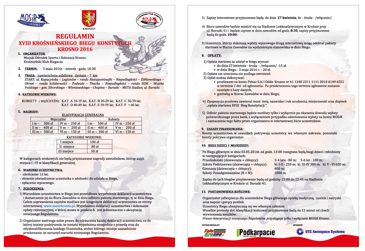 Więcej informacji w Regulaminie XVIII Krośnieńskiego Biegu Konstytucji