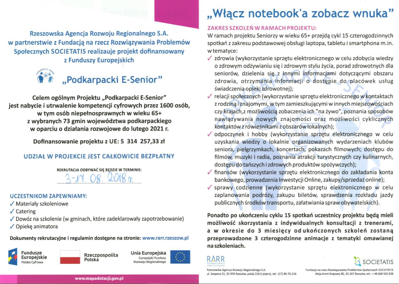 Projekt „Podkarpacki E-Senior” finansowany jest ze środków Unii Europejskiej w ramach Działania 3.1 ,,Działania szkoleniowe na rzecz rozwoju kompetencji cyfrowych” Programu Operacyjnego Polska Cyfrowa na lata 2014-2020. Beneficjentami są: Rzeszowska Agencja Rozwoju Regionalnego S.A., Fundacja na rzecz Rozwiązywania Problemów Społecznych Societatis i we współpracy z Miastem Krosno.