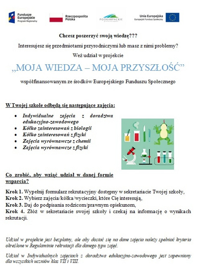 W Szkole Podstawowej Nr 5 zakończyły się "Zajęcia dydaktyczno - wyrównawcze z chemii” - zorganizowane w ramach projektu pn.”Moja wiedza – moja przyszłość” współfinansowanego ze środków Europejskiego Funduszu Społecznego w ramach Osi Priorytetowej IX Jakość edukacji i kompetencji w regionie, Działanie 9.2 Poprawa jakości kształcenia ogólnego Regionalnego Programu Operacyjnego Województwa Podkarpackiego na lata 2014 - 2020.