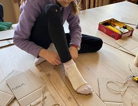 Wszyscy uczestnicy spotkania przybyli na miejsce odpowiednio wyposażeni i gotowi do podjęcia sportowych wyzwań. Rozpoczęliśmy od przygotowania niezbędnego w sportach zimowych sprzętu. Dzieci z pomocą rodziców, pod okiem prowadzącej zajęcia Anny Tomaszewskiej, przygotowały gogle narciarskie z papieru oraz narty z kartonu. Następnie rozłożyliśmy pachołki wyznaczające trasę i... przystąpiliśmy do zawodów. Wyścigi na wykonanych własnoręcznie nartach i kocach zastępujących sanki sprawiły wszystkim wiele radości.